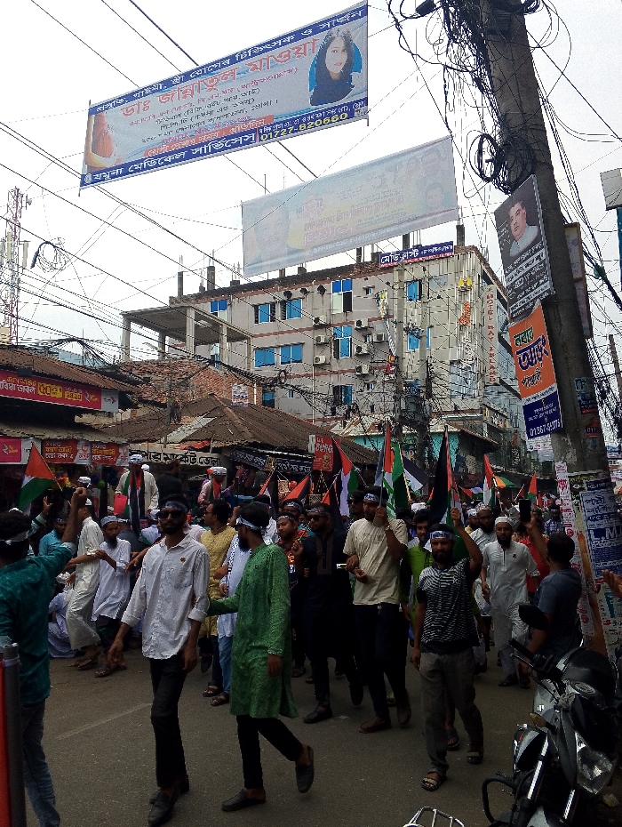 group of people, primarily men, marching in a street in Bhola, Bangladesh, at the coordinates 22.685 latitude and 90.644 longitude. The street is lined with buildings and shops, with power lines running overhead. Some of the people in the procession are holding flags, primarily green, black and white, associated with the Palestinian national colors. The individuals are dressed in everyday clothing, with some wearing traditional garments. There are posters and banners in the background with text written in Bangla, the native language of Bangladesh. The scene is crowded, suggesting a rally or protest. The people appear to be engaged in a demonstration or gathering.