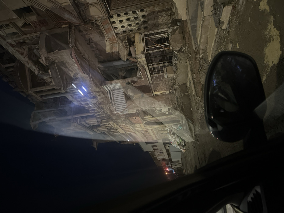 A night scene captured from inside a vehicle. The building exterior shows significant decay and possible demolition. A side mirror partially obstructs the view of the damaged building, street, and some stacked materials. A car light reflection can be seen. A glimpse of adjacent buildings further down the street and the night sky round out the composition.
