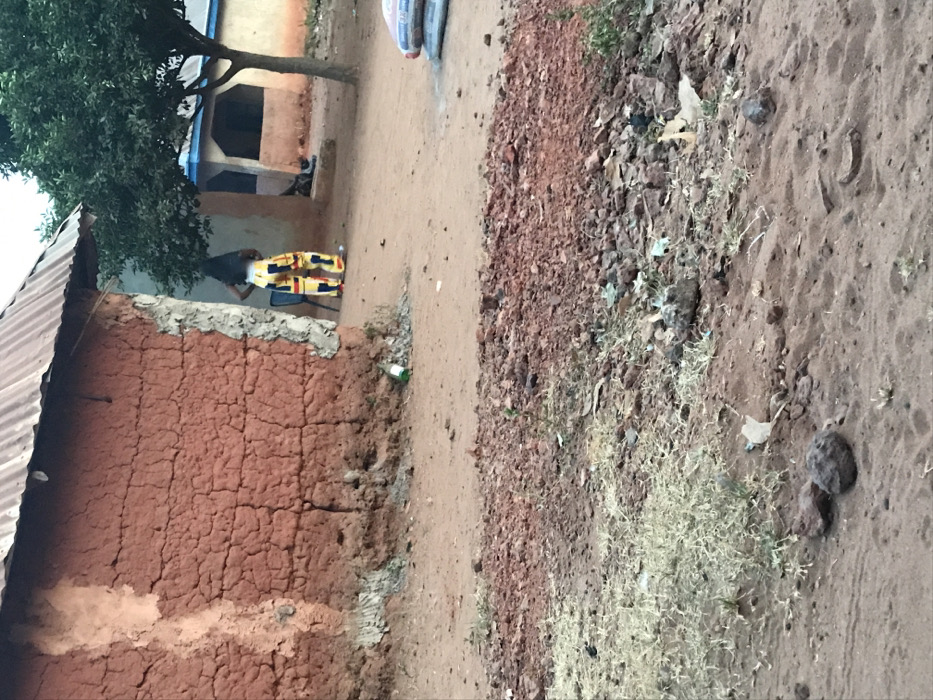 A horizontal outdoor shot showcases a rural scene with a dirt path and clay structure. A woman in vibrant yellow and black pants stands beside the structure, near a small tree. The building has a corrugated metal roof. The ground transitions from dirt to a rocky patch with sparse vegetation. In the background, another building with a blue tarp roof is visible, adding depth to the scene.