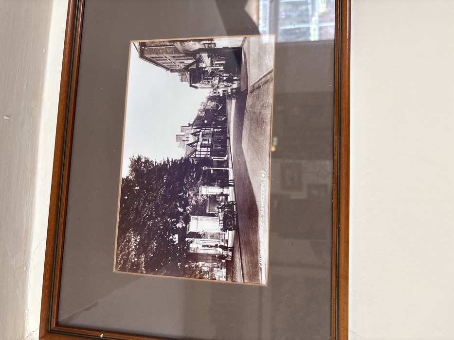 This framed, sepia-toned historical photograph depicts a street scene identified by its caption as Church Street, Oswestry, United Kingdom, likely from the early to mid-20th century