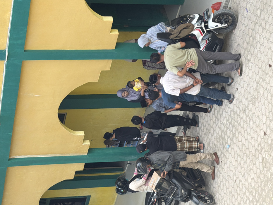 A group of people, including a woman in a hijab holding a child, are lined up near a building with yellow and green architectural details. Most are standing and facing forward, heads bowed in what appears to be prayer or a similar act of reverence. Two motorbikes are parked nearby, indicating they may have arrived together. The scene suggests a gathering outside a religious building or mosque.