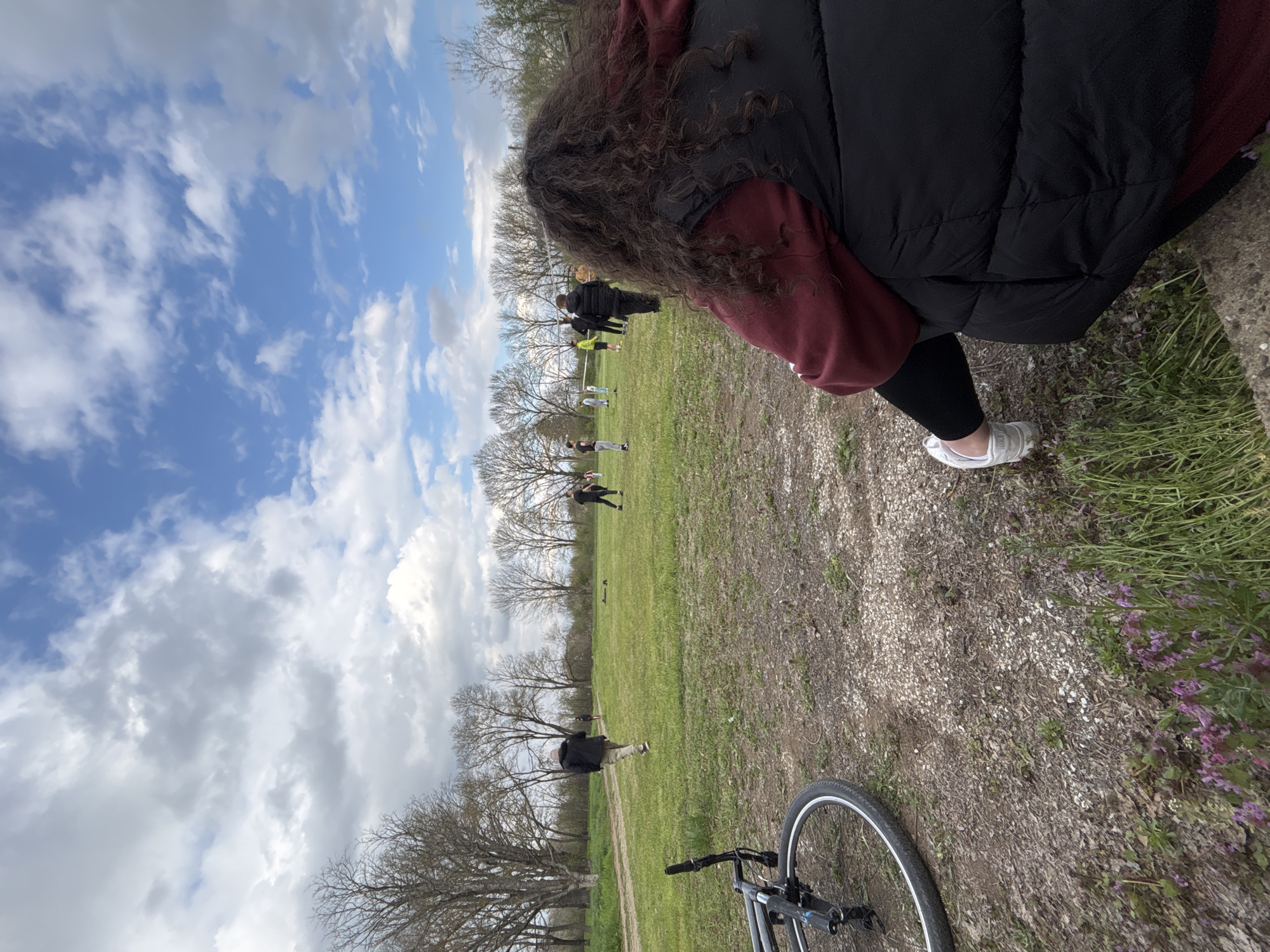 A medium-shot, tilted outdoor image. A person wearing a black puffy vest, a maroon hoodie, black leggings, and white sneakers is partially visible on the right. Their curly brown hair is also visible. In the distance, a group of people are standing on a green field. Bare trees are scattered throughout the field. A bicycle is in the lower right foreground. The sky is visible in the upper left, with a mix of blue sky and white clouds. The location appears to be a park or grassy area. There is no information in the image to suggest that the location is Gromshin, Bulgaria.