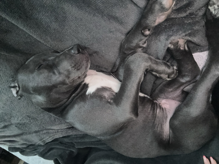 - "A dark gray or blue-gray Pit Bull type dog is depicted sleeping soundly, curled on its left side on a textured, dark gray blanket or fleece throw" by FM-NMkt72, licensed under CC BY 4.0