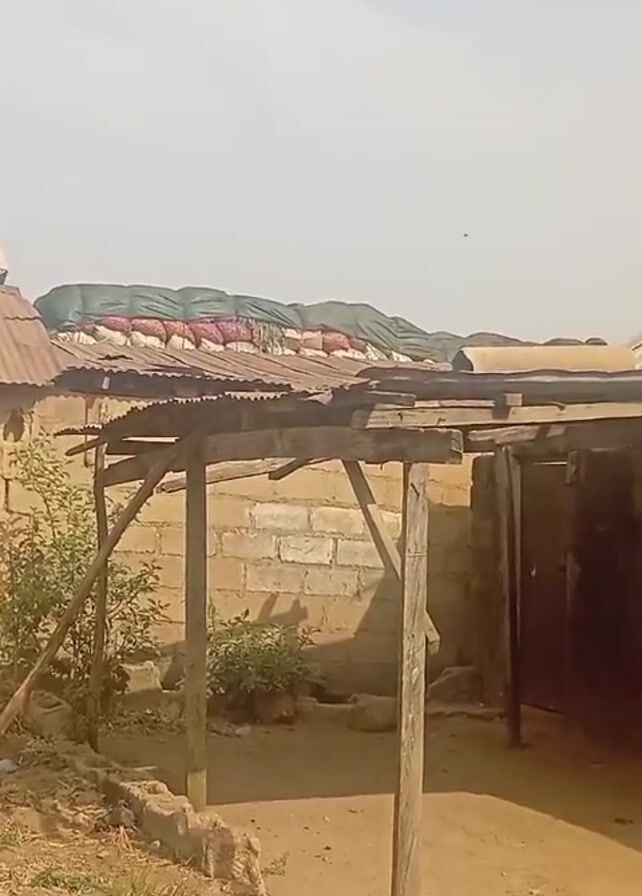 person on a corrugated metal roof stacking burlap sacks filled with an unknown substance. The structure beneath the roof appears to be a building made of mud brick. There is a smaller wooden structure in the foreground. The ground is dry and barren. As the camera pans, a second person is visible assisting with the stacking on the roof. There are small trees surrounding the building. The sky is light blue with a few clouds.