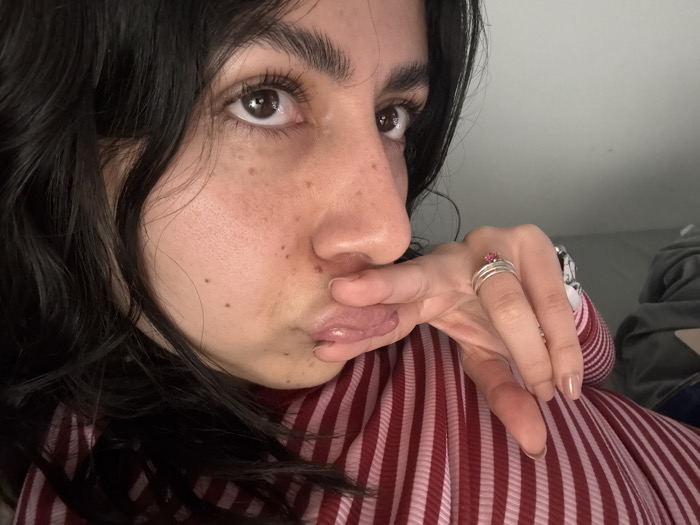 A woman poses closely, her face filling most of the frame. She has dark, curly hair and light skin with freckles. Her eyebrows are thick and dark. She wears a red and white striped shirt. One hand is raised, her fingers touching her pursed lips. She wears multiple silver rings on her ring finger, one with a red stone. Her nails are painted a light neutral color. The background is out of focus, showing a wall and some indiscernible objects.