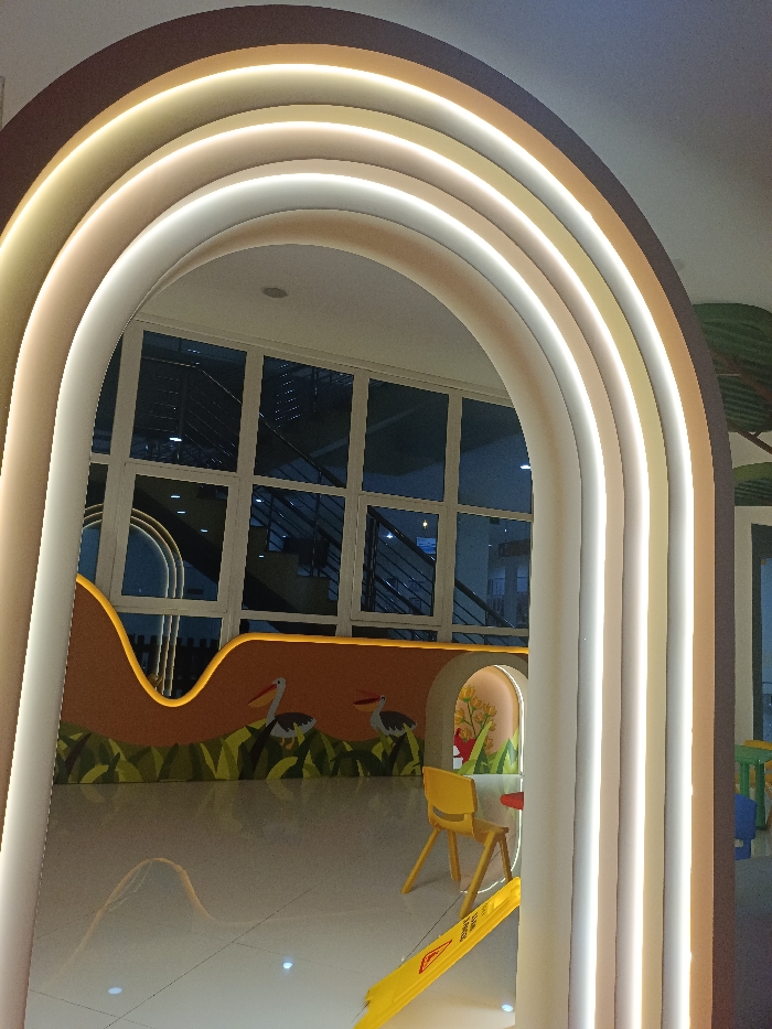 An interior scene in Margorejo, Indonesia, depicts a brightly lit, organized space, likely a children's activity area. In the immediate foreground, a large, multi-banded archway frames the view. This archway consists of concentric, illuminated segments in shades of brown, yellow, beige, and white. The floor is light-colored, reflective tile, showing reflections of the archway's illumination. Beyond the archway, a yellow plastic child's chair is partially visible, positioned next to a small, low table. A yellow "CAUTION WET FLOOR" sign lies diagonally on the floor, partially obscured by the archway. Behind these items, a low wall features a decorative mural depicting an outdoor scene with green foliage against an orange background and two stylized pelican-like birds with white bodies and red beaks. Integrated into this wall is a smaller, arch-shaped alcove, illuminated from within, containing red and yellow artificial flowers. Further in the background, a large, grid-patterned window wall reveals an interior space with a dark staircase and additional structural elements, suggesting a multi-level building. No individuals are present in the scene, and no actions or interactions are depicted.