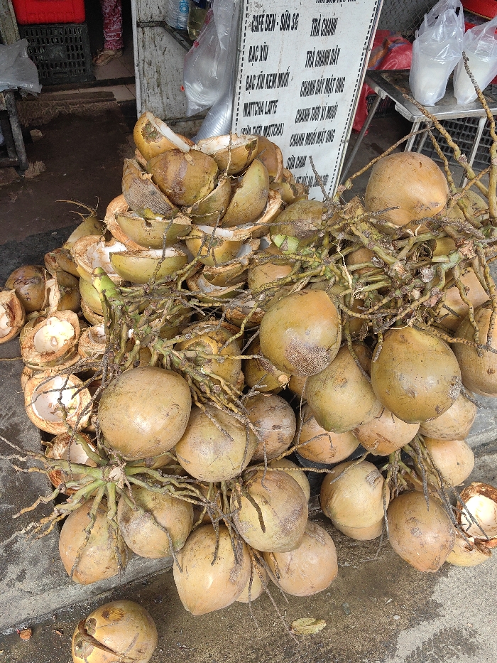 The scene depicts an outdoor beverage stall in Vỹ Dạ Ward, Vietnam. The foreground is dominated by a large, irregular pile of light brown coconuts, many still connected by their natural fibrous stems. Interspersed throughout and forming a prominent pile behind these whole coconuts are numerous discarded coconut husks, indicating ongoing processing. The ground beneath is a damp, mottled gray concrete surface. In the upper left background, the lower legs and sandaled feet of an individual are partially visible behind a red plastic crate. To the right, a vertical white menu board with black Vietnamese text lists various beverages, including "CAFE ĐEN - SỮA SG" and "TRÀ CHANH." Adjacent to the menu board, a light-colored metal table supports clear plastic bags, likely containing ingredients, and several empty plastic cups. A clear plastic bottle is positioned above the menu board. A white corrugated metal wall serves as a backdrop to the right side of the scene.