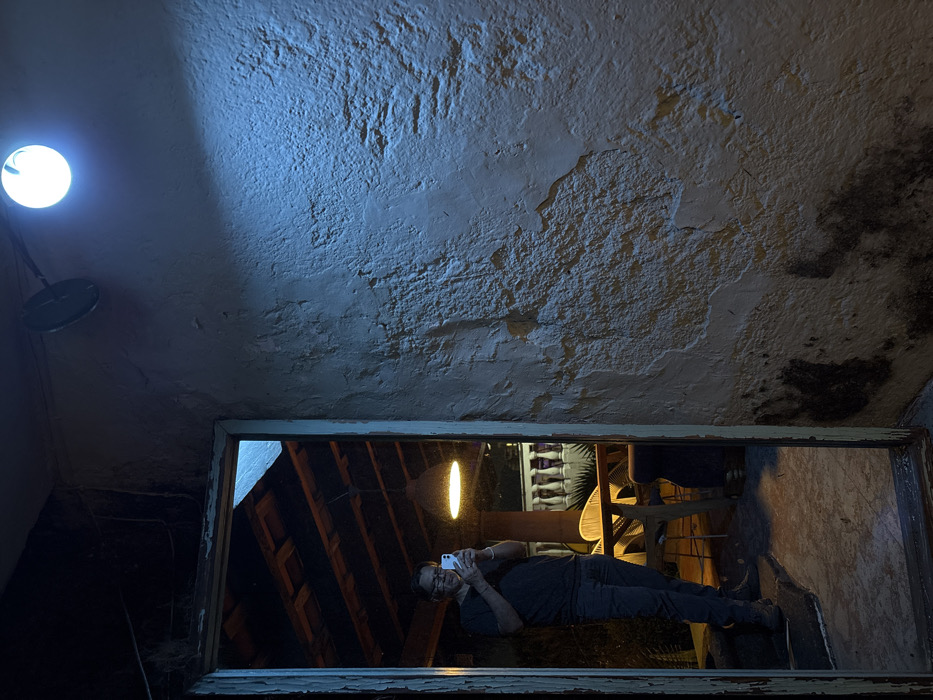 The scene depicts an interior view looking through a doorway into a covered outdoor or semi-outdoor area in Cuernavaca, Mexico, under low light conditions, likely at night. Through the doorway on the left, a male individual is visible, standing and facing away from the camera, holding a white smartphone horizontally in both hands, appearing to operate it. He is dressed in a dark t-shirt and dark trousers. The background of this area includes exposed wooden ceiling beams and a warm, orange-glowing bell-shaped pendant lamp. Below the lamp, a wooden table is flanked by several woven chairs. Further in the background, a white balustrade or railing is discernible. The floor in this external area is a light-colored concrete or stone. On the right, an immediate wall with a textured, possibly stuccoed, surface shows signs of wear, including flaking paint and dark, irregular discoloration at its lower section, consistent with moisture or mold. A bright, circular, cool-toned light fixture is mounted high on this wall, casting a distinct blue illumination downwards. Above the doorway and to the left of the bright light, a dark, circular object is affixed to the wall. The doorway itself appears to be a simple, worn frame.