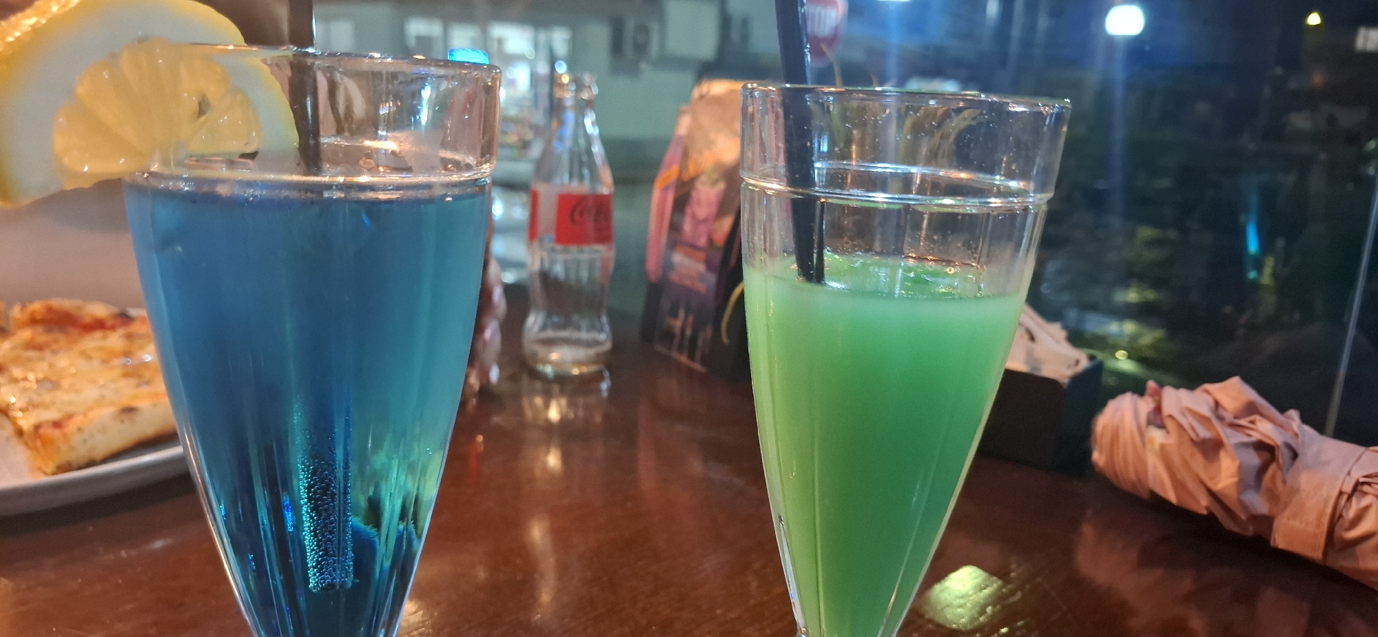 The image depicts two colorful beverages on a wooden table, with a slice of pizza visible on a plate to the left. The left drink is blue and garnished with a lemon slice. The right drink is green and has a black straw. A glass Coca-Cola bottle is situated behind the blue drink. In the background, there is an illuminated street scene visible through a window, suggesting an outdoor or semi-outdoor setting at night. The presence of outdoor lighting suggests the location could be in Botevgrad, Bulgaria. A wadded-up pink napkin is situated on the right.