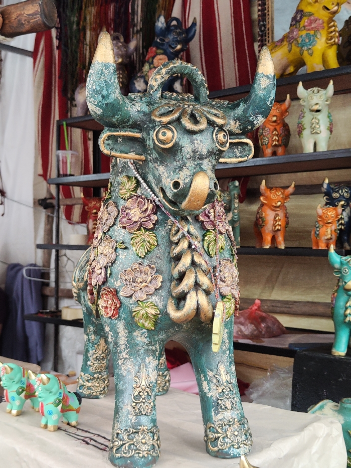 An intricately decorated, turquoise-colored bull sculpture stands prominently