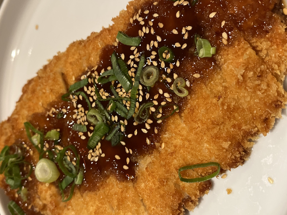 A close-up, slightly overhead view depicts a golden-brown, breaded cutlet, possibly Katsu, served on a plain white ceramic plate