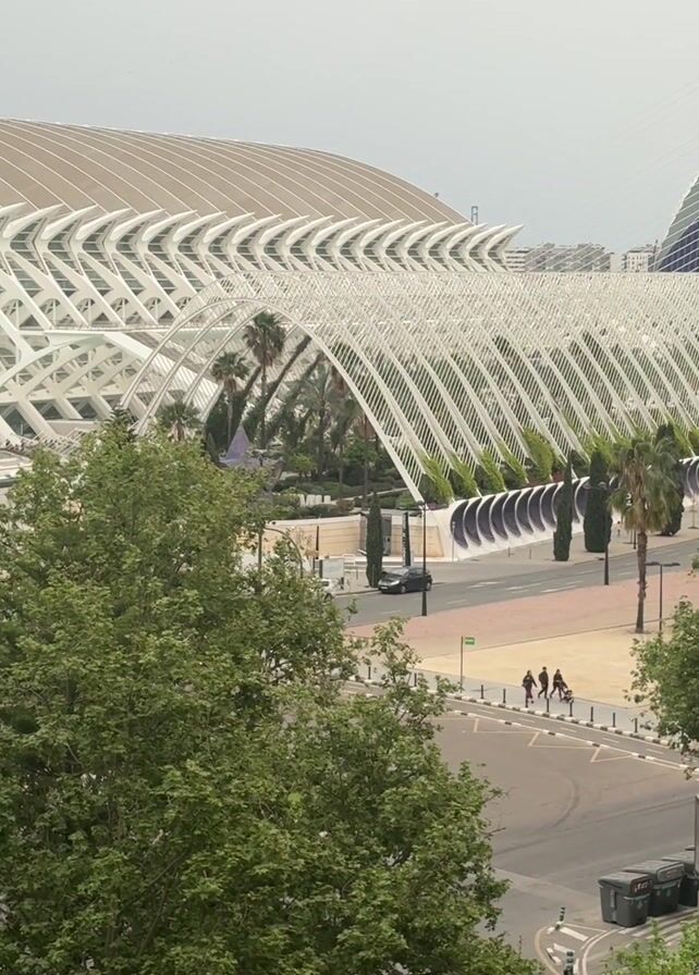high-angle view of a modern architectural complex, likely a science or cultural center, with white, curved structures dominating the landscape. Green trees partially obscure the foreground and street level, where pedestrians are walking. A black car is visible on the street. The sky is overcast, suggesting a cloudy day. The overall scene conveys an urban environment with futuristic architecture integrated into a somewhat green space.