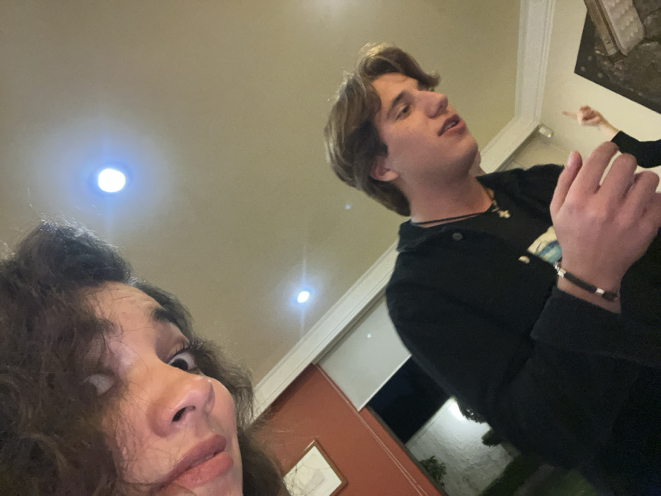 A low-angle shot captures two people in an indoor setting. A woman with curly hair fills the left foreground, looking slightly upward with an expression of surprise. A young man stands to the right, wearing a black jacket and a necklace with a pendant. He's mid-sentence, his gaze directed off-camera. The room is lit by overhead lights, and a window is visible in the background. An arm and a pointing finger are visible in the upper right of the picture. A framed picture hangs on the wall.