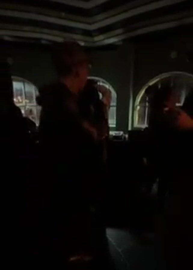 A dimly lit room with several people standing near windows. A DJ booth can be seen in the background. The ceiling has a geometric pattern with black and white stripes. The atmosphere appears to be a bar or club setting with music playing. Some red lights cast patterns on the ceiling. Most people are dressed casually and are facing the DJ area. There appears to be a leafy decoration hanging from the ceiling.