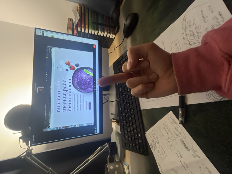 The scene depicts an indoor desk environment located in Sofia, Bulgaria. A human right hand, wearing a pink long-sleeved garment, is centrally positioned in the foreground, displaying an upward-extended middle finger. This hand rests above a dark green desk mat. To its left, white papers with handwritten Cyrillic script and sketches, along with a black pen, are visible. Directly behind the hand is a black computer keyboard. A black desktop monitor occupies the background, displaying a webpage with a header in Cyrillic script that reads "пин-пин-рабо ръчноизработени пиняти" (pin-pin work handmade piñatas). The webpage also features descriptive text and an image of a purple smoothie bowl adorned with strawberries, blueberries, and blackberries. A black optical mouse is situated to the right of the keyboard. To the left of the monitor, a gray articulated desk lamp and a gray mug with white polka dots are present. To the right of the monitor, a vertical stack of colorful, rectangular objects is visible.