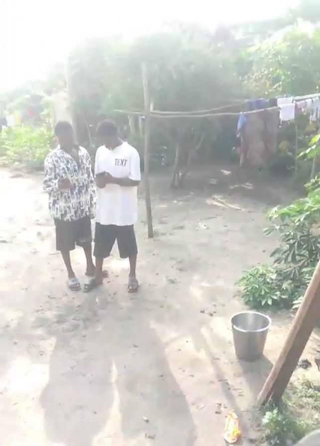 n outdoor scene with three people. One person is in the foreground with their back to the camera. They are wearing a black T-shirt and have dreadlocks. In the background, two other individuals stand on a dirt surface. They are both wearing shorts and T-shirts, and one is looking at a cell phone. There is a metal bucket on the ground, clothes hanging in the background, and some plants and trees are visible. The scene is sunny, casting shadows on the ground.