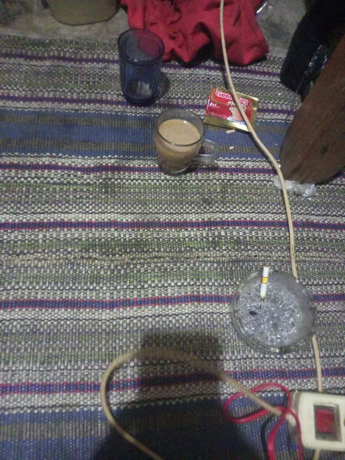 The image displays an indoor ground-level scene in Ciherang, Indonesia, featuring various items arranged on a multi-colored woven mat. The mat exhibits horizontal stripes in shades of blue, green, white, red, and purple. In the upper left quadrant, an empty, translucent blue glass tumbler stands upright. Directly below and to the right of this glass, a clear glass mug contains a light brown liquid, consistent with coffee, with fine sediment visible at the bottom. Adjacent to the mug, a small red and gold packet labeled "Good Day Mocha" rests on the mat. In the upper right background, a crumpled red fabric item is partially visible. A light-colored electrical cable snakes diagonally across the mat from the upper right, casting a shadow to the lower left. In the lower right quadrant, a clear glass ashtray is filled with numerous cigarette butts and grey ash; one cigarette with a white filter and a yellow band stands upright within the ash. A white power strip with a red switch, into which red electrical wires are plugged, is partially visible in the bottom right corner. No individuals are present.
