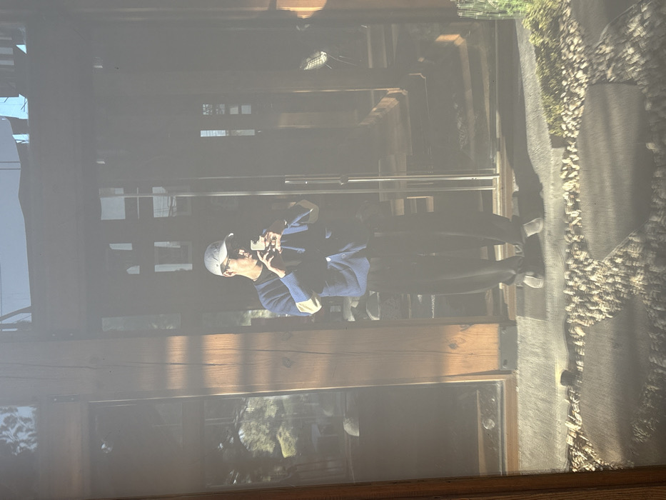 A person wearing a hat, blue shirt, and dark pants is taking a picture with their phone. They are standing outside, with a wooden structure behind them that appears to be part of a building or fence. To the right, there's a gravel area or path. The image is somewhat washed out and appears to be taken through a window, adding a hazy effect to the scene.