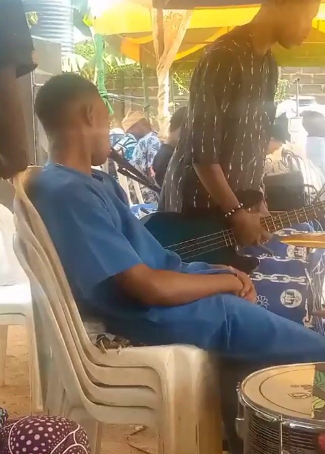 band setting up under a tent or awning in an outdoor setting. A man in a blue outfit sits on a white plastic chair, arms crossed. Behind him, another man wearing a patterned shirt is adjusting a bass guitar. Other band members are visible in the background, including one working with a sound mixer. A drum set is partially visible next to the seated man. The overall environment appears to be casual and relaxed as they prepare for their performance. A "TECNO SPARK" logo is visible at the bottom left.