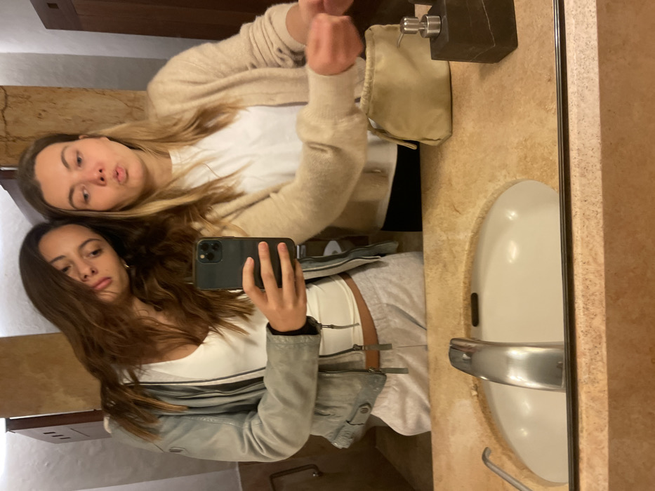 Two young women take a mirror selfie in a bathroom. The foreground girl wears a white tank top under a faded blue jacket, paired with grey sweatpants. Her long brown hair falls to her shoulders. The background girl, slightly out of focus, wears a white shirt under a beige cardigan. Her blonde hair is also long. A white sink is visible to the right of the frame, next to a beige countertop with a soap dispenser. The lighting appears to be soft and natural.