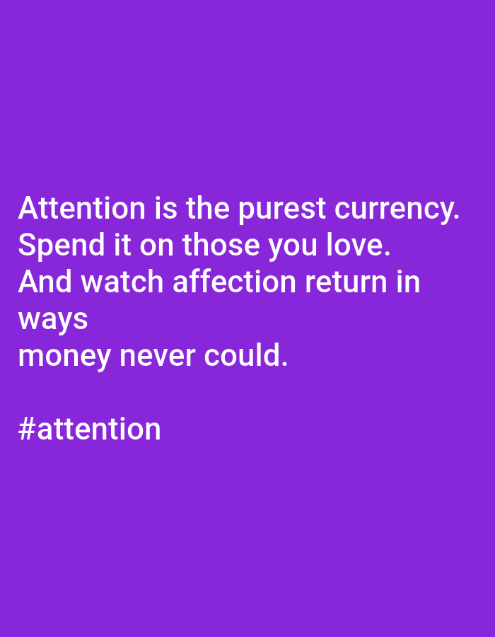 This image displays white sans-serif text centered against a solid purple background. The text reads: "Attention is the purest currency. Spend it on those you love. And watch affection return in ways money never could." Below this, a single hashtag appears: "#attention". There are no discernible people, objects, or environmental features in the image to indicate a specific location in Ciherang, Indonesia, or any other city.