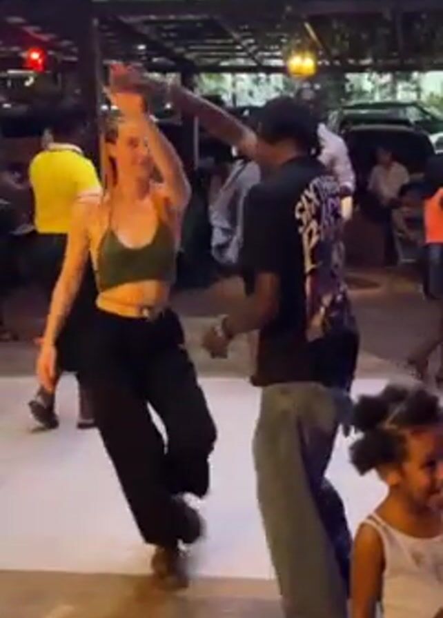 A group of people are dancing at an outdoor party. A woman with reddish hair, wearing a green top and black pants, dances with a man in a black t-shirt and grey baggy pants. They hold hands and spin around. Several other people are dancing nearby. A young girl in a white dress looks on with wide eyes. String lights hang from the pergola above.