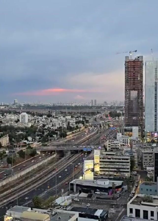 n aerial view of a cityscape, with a wide highway cutting through the center. Multiple skyscrapers dominate the skyline, some under construction with cranes visible. Cars move along the highway, and buildings of varying heights make up the surrounding urban landscape. The sky is overcast with hints of a pink sunset.