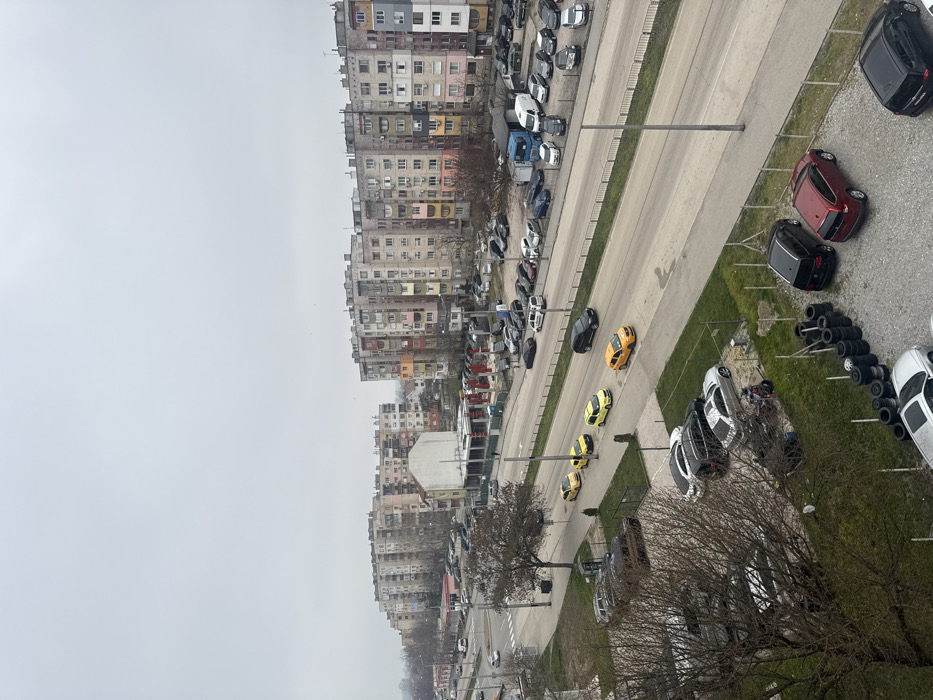This image presents an elevated, wide-angle view of an urban landscape in Vidin, Bulgaria, under an overcast sky. The scene is dominated by multi-story residential apartment blocks, primarily situated in the mid-ground and background, exhibiting various shades of pastel and neutral colors, indicating a range of maintenance states and architectural styles common to post-World War II Eastern European construction. A multi-lane asphalt thoroughfare runs horizontally across the mid-ground, separating foreground parking areas from the distant buildings. Vehicular traffic is observable on this road; notable vehicles include four yellow compact vans/cars parked on the right shoulder, and one orange compact car following behind. A black SUV travels eastbound, and a red SUV is parked in a lot in the lower right quadrant. Numerous other passenger vehicles are parked in various paved and unpaved lots adjacent to the road and foreground. In the mid-ground, to the right of the main road, a construction site is visible with red scaffolding structures. Further right, a light blue storage container or small building is present amidst parked cars. In the lower right foreground, an unpaved area contains multiple stacks of black rubber tires, indicative of a tire service or storage facility. Another unpaved parking area in the lower left foreground is partially obscured by bare deciduous tree branches, and several silver and dark-colored vehicles are parked there. One individual is discernible walking on the sidewalk adjacent to the main road in the mid-ground. The overall environment suggests a cooler season, given the bare state of the trees and the muted, cool color palette of the sky and surroundings.