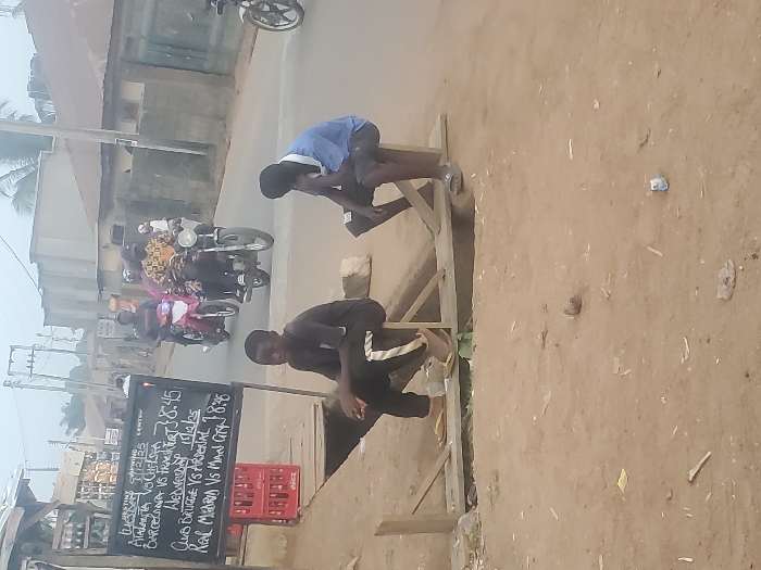 Two young men are sitting on a makeshift bench on the side of a dusty road. One wears a blue shirt and the other a dark colored shirt. Behind them is a blackboard with a list of soccer teams and odds, possibly advertising a betting business. Motorbikes pass by on the road behind the men and sign. A building is visible in the background. The scene appears to be in a rural area.