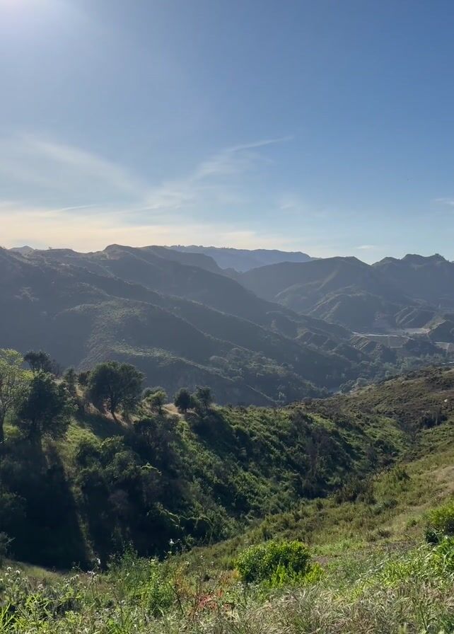 mountainous landscape under a bright, clear blue sky with the sun shining. The hills and mountains are covered in green vegetation and trees. The camera appears to be positioned on a hillside, looking out over a valley with a view of more distant mountains. The foreground has tall grasses and other plants. There are no people visible in the video.