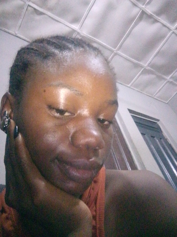 A young woman with dark skin rests her cheek on her hand, glancing downward. Her hair is braided closely to her scalp. She wears an earring with a silver and black pattern in her left ear. A tan top is visible on her shoulder. The background shows a ceiling with square recessed panels and a partially visible window with dark blinds. The lighting in the room appears dim and cool.