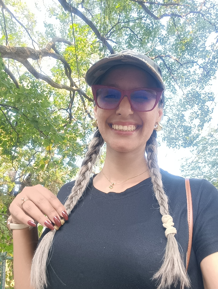 A smiling woman with light brown braids is photographed outdoors. She wears a camouflage hat, red sunglasses, and a black t-shirt. A delicate gold necklace is visible. Her fingernails are painted a maroon color. She is holding one of her braids. Lush green trees and blue sky fill the background, creating a bright and natural setting.