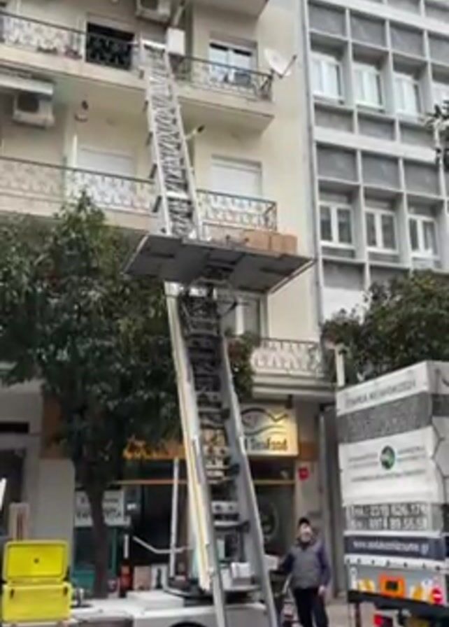 A man standing next to a moving truck looks upward at a tall, mobile ladder lift extending to the balcony of an apartment building. The lift carries cardboard boxes to a higher level. The truck bears Greek text and a phone number. The building behind the lift is several stories high, with multiple windows and balconies. The area appears to be an urban street, with trees and a building labeled "SeaFood" in view.