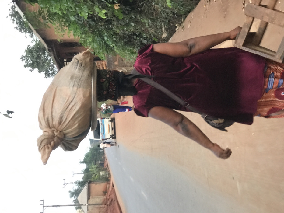 An adult female, viewed from behind, walks along a dirt shoulder adjacent to a paved road in the city of Unknown, Unknown. She wears a maroon short-sleeved top and a patterned skirt. A large, light-colored fabric sack rests on a metal tray balanced on her head, secured by a dark head covering. A dark shoulder bag strap crosses her back, and she holds a light-colored wooden crate in her left hand. On the paved road, a white passenger van with blue accents is visible. A male in a white shirt and dark pants walks towards the van, and another person in a blue top and patterned pants stands nearby. Utility poles and single-story, reddish-brown buildings line the left side of the road. Dense green vegetation and a partially visible reddish-brown building border the right side. The sky is overcast, with two dark, bird-like shapes visible in the upper mid-frame.