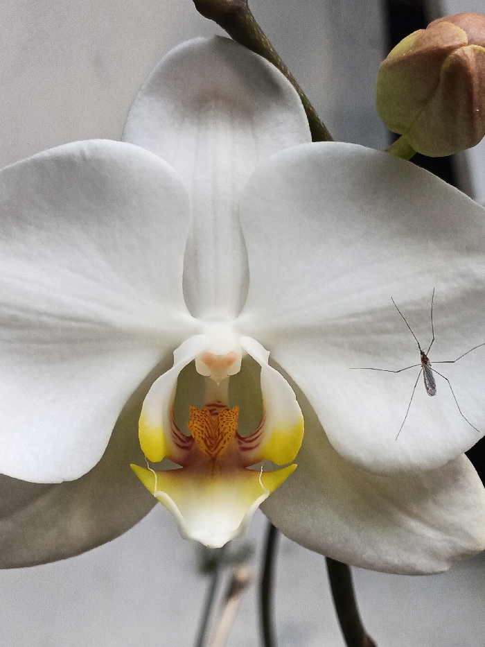 A close-up showcases a white moth orchid in full bloom. Its petals are broad and smooth, with a touch of veining. The flower's center features a vibrant blend of yellow, orange, and red hues. A long-legged insect rests delicately on one of the lower petals. Above the bloom, a bud in shades of green and brown hints at future blossoms. A slender stem is visible, anchoring the orchid.