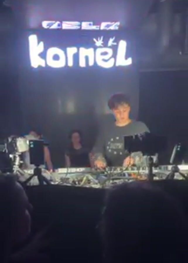 A young DJ is performing at a club, standing behind a mixing console. The DJ is light-skinned, wearing a long-sleeved, dark shirt with white patterns, and has short brown hair. Behind the DJ is a large LED screen displaying the name “Kornel” in a colorful, stylized font. A second person can be seen behind the DJ, also likely involved in the performance. A crowd is visible in the foreground, silhouetted against the light from the stage. The lighting is dark with bright stage lights illuminating the performers. The atmosphere suggests a lively, energetic music event.