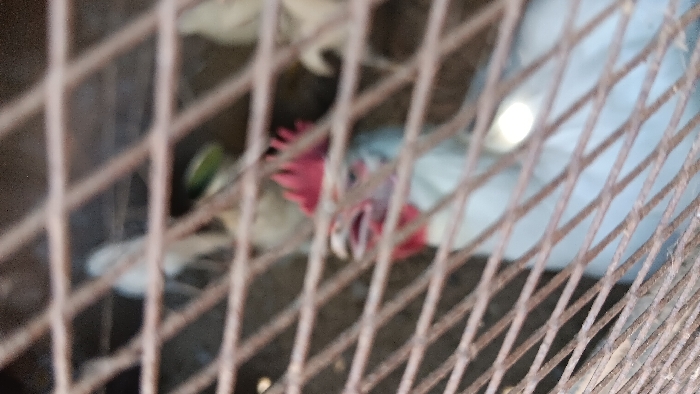 - "The image depicts a partially obscured view of a white rooster within a wire mesh enclosure in Kuru, Nigeria" by FM-6rqTj2, licensed under CC BY 4.0