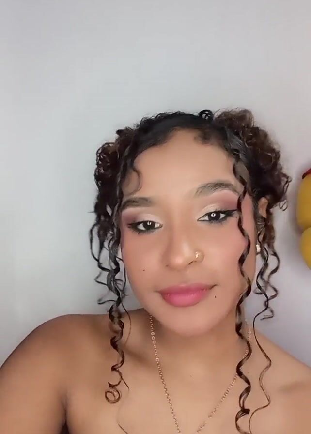 The video presents a medium shot of a young woman with curly hair styled in a partial updo, with several strands left loose and cascading. She is wearing makeup, which includes pink blush, lipstick, and eye makeup that features a distinct winged eyeliner. She has a gold necklace with a shell-shaped pendant around her neck and a gold hoop earring in her left ear. Behind her is a plain white wall, with a yellow stuffed animal partially visible on the right side of the frame. She is looking directly at the camera with a slight smile and touches her hair briefly at one point. The lighting is bright and evenly distributed.