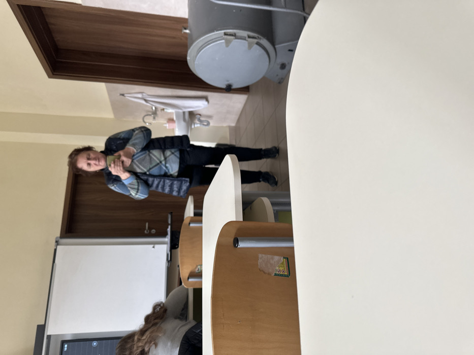 The scene depicts an indoor educational or laboratory environment in Stara Zagora, Bulgaria. In the foreground, a white-topped student desk occupies the lower half of the frame. To its left, the back of a light wood-grain student chair is visible, featuring a small, faded rectangular sticker on its backrest. Further left, the shoulder and back of a person with long, wavy brown hair, wearing a grey top, are visible as they sit at another white-topped desk. In the midground, a woman with brown, curly hair stands centrally. She wears a blue plaid long-sleeved shirt beneath a dark blue puffer vest, dark pants, and dark athletic shoes. Her hands are clasped around a light-colored smartphone, at which she gazes downwards. Behind her to the left, a white magnetic whiteboard with a black frame is mounted on a light-colored wall. A digital display to its left indicates "13:30". To the woman's right, a white ceramic sink with a chrome faucet is wall-mounted. A light pink soap dispenser is positioned on the wall to the right of the faucet, and a white towel hangs on a hook further right. The background features light cream-colored walls and a light-tiled floor. Two dark brown wooden doors are partially visible; one to the far left behind the whiteboard, and another more prominently on the right. To the far right, a large, grey, cylindrical piece of equipment, possibly a laboratory autoclave or processing unit, rests on the floor with two visible latches on its side.
