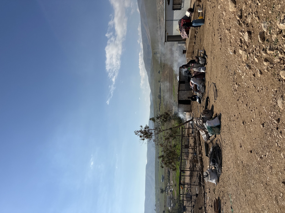 The image displays an arid outdoor environment in Ras 'Ein al 'Auja, Palestinian Territory, under a clear blue sky with minimal cloud cover. The foreground consists of dry, rocky, reddish-brown soil, sparsely scattered with white sacks, coils of black hosing, and a metal basin. In the midground, a cluster of structures is visible. To the left, a skeletal framework of metal poles stands. Centrally, a single-story structure constructed of light-colored blocks is present, emitting white smoke from its front, indicating an active fire. Approximately five individuals are gathered in this central area; one person in dark attire is seated on the ground near the smoke, while others stand or stoop amidst numerous white sacks and metal containers. To the far right, a rectangular, white modular building with a flat roof is situated. A person wearing a dark blue top and light-colored bottom stands beside a blue plastic barrel near this building. Stacked wooden pallets are also visible adjacent to the white structure. The background features rolling, predominantly green and brown hills, with a faint white structure discernible in the distant left midground.