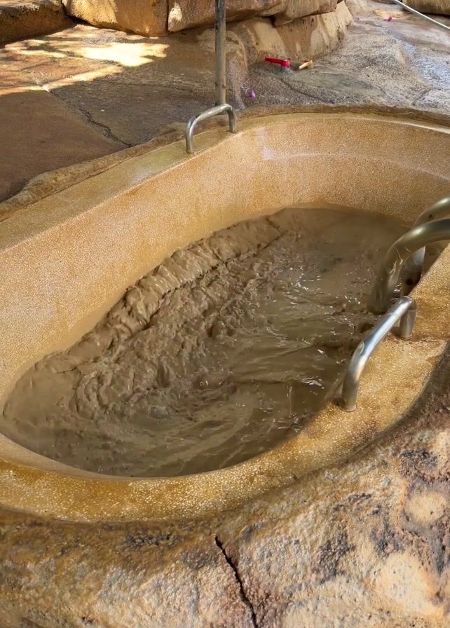 stone-like tub filled with muddy water. Metal fixtures extend into the tub. The tub is situated in an outdoor area with other stone structures and foliage. A small waterfall can be seen in the background. The camera zooms out to reveal more of the surrounding area, including a shaded structure over the tub. There are tools and other items scattered around the base of the tub.