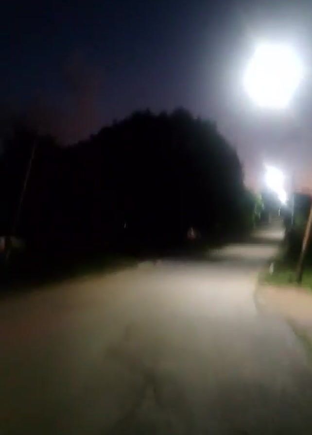 first-person perspective of someone moving down a dark road at night, illuminated by streetlights