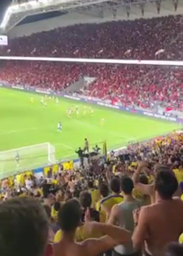 crowd of people gathered at a soccer stadium. Many are wearing yellow jerseys or are shirtless. Some of them are standing at the edge of the stands and near a fence. A group of soccer players are on the green field. In the distance, there are more people filling stadium seating in a sea of red. The stadium is brightly lit. The crowd seems to be cheering.