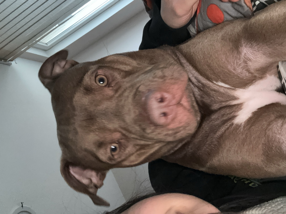 The scene is an interior view located in Malevo, Bulgaria. A brown-furred, medium-sized dog, consistent with a Pitbull-type breed, is positioned centrally, looking directly at the camera. The dog has a pink nose, light brown eyes, and a prominent white patch on its chest. Its ears are partially folded back. To the lower-left, a portion of a human face with dark hair is visible, indicating the presence of a person. On the lower-right, a human arm or hand rests on bedding that features a grey background with orange circular patterns. The background includes a light-colored wall, a white ceiling with a circular light fixture in the upper-left, and a window with horizontal blinds in the upper-right, allowing ambient light. The dog appears to be resting against a person or is in very close proximity.