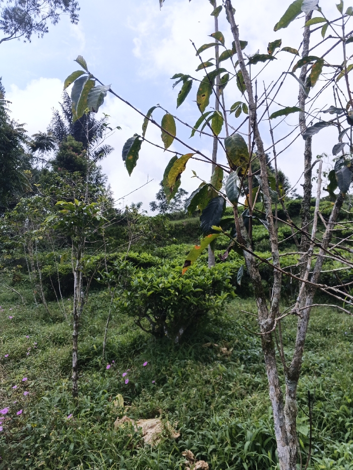 This image depicts a natural, rural landscape in Nanlao, China, primarily consisting of agricultural vegetation on a gentle incline under a partially cloudy blue sky. In the foreground, a prominent, slender tree with sparse branches and green leaves, some exhibiting yellowing or brown spots, stands on the right side of the frame, extending upwards. To its left, several younger, equally slender trees with minimal foliage are visible. The ground is covered with dense green grass, various smaller plants, and scattered pink-purple wildflowers. Patches of lighter-colored soil or rock are interspersed within the ground cover. The midground features a cultivated field of uniform, dense green shrubs, consistent with a tea plantation, extending across a gentle slope. In the background, further hills covered with trees and dense vegetation are visible beneath the same sky. No human figures, animals, or man-made structures are present within the scene. The lighting is natural daylight, indicating an outdoor environment.