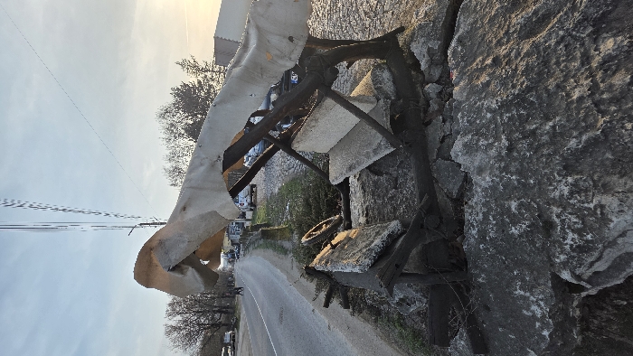 The image displays a roadside scene in Lukovit, Bulgaria, during either early morning or late afternoon, indicated by the low angle of the sun. In the immediate foreground, a large, grey, irregular rock formation or ruined stone wall dominates, featuring visible cracks and lichen. Resting upon and integrated into this formation is a collection of debris, including broken concrete slabs, dark wooden beams and planks, and a segment of a wooden wagon wheel. A tattered, light-colored fabric, possibly canvas or tarp, is draped over a rudimentary wooden framework, forming a partial, elevated structure or covering above the debris. To the left of the foreground, an asphalt road extends into the distance. A narrow, unpaved verge separates the road from the foreground elements. Further down the road, two distant figures are visible walking. Multiple parked vehicles are present along the left side of the road, which is lined with bare-branched deciduous trees. To the right of the foreground debris, a rough, possibly cobblestone or gravel, area accommodates several parked vehicles, including a white SUV with a partially visible Bulgarian license plate. Sparse green vegetation, consistent with grass and small bushes, grows in unpaved sections. Overhead, utility poles with multiple overhead wires cut across a light blue sky with minimal cloud cover. The sun, low on the horizon to the right, casts a warm illumination across the environment.