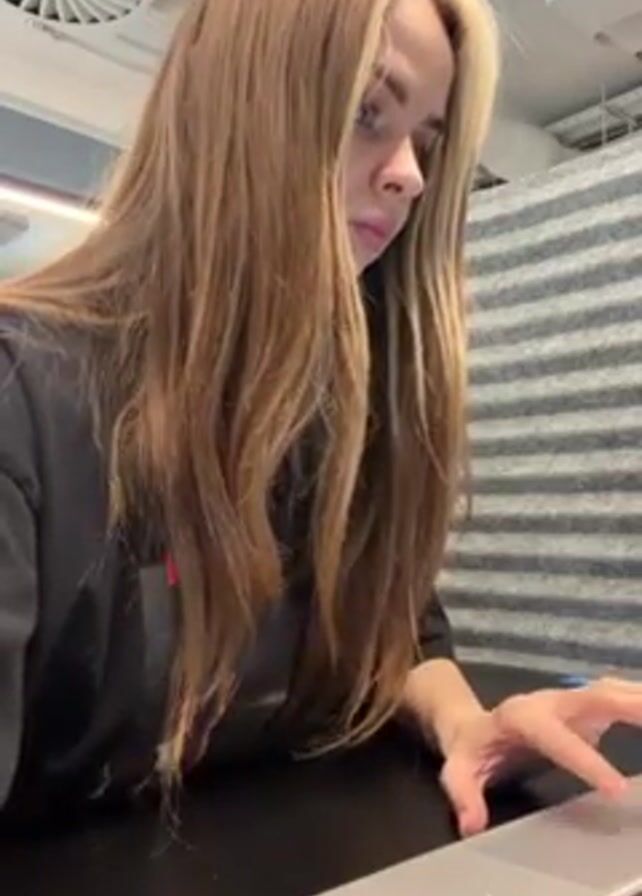A woman with long blonde and brown hair is seated at a desk, focused on a laptop. Her left hand rests on the laptop's touchpad, while her right hand appears to be using a pen or stylus. The laptop is silver and has a sticker on it. She is wearing a black jacket or sweatshirt. The environment includes a ceiling ventilation unit and a wall with horizontal gray panels. The lighting is artificial.