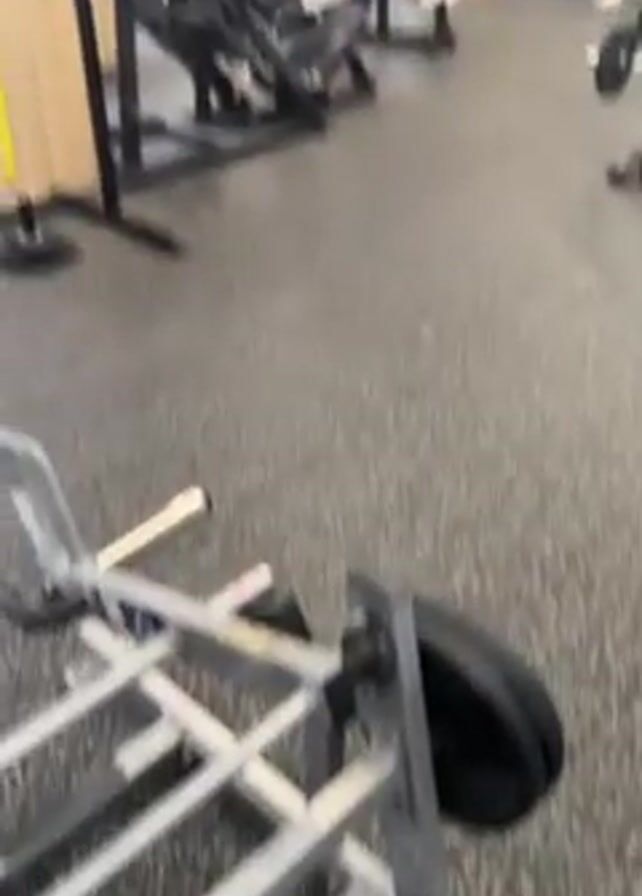 The camera pans across a gym interior