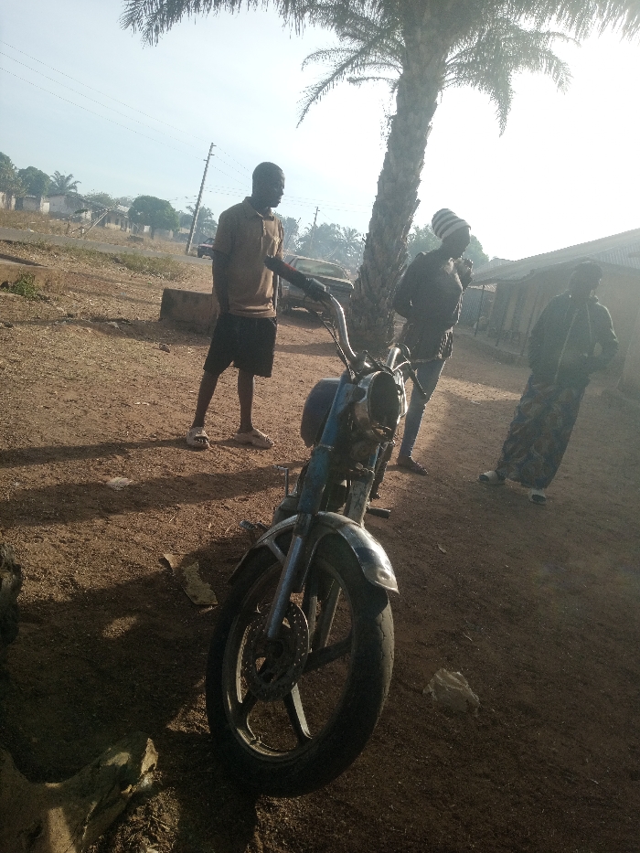 An old blue motorcycle is parked on dirt ground with three people standing nearby. One man in a polo shirt and shorts stands to the left, a person in a striped hat and dark clothing stands behind the motorcycle, and a person in a long patterned dress stands on the right. A palm tree is behind the group. Buildings and a utility pole are in the background.