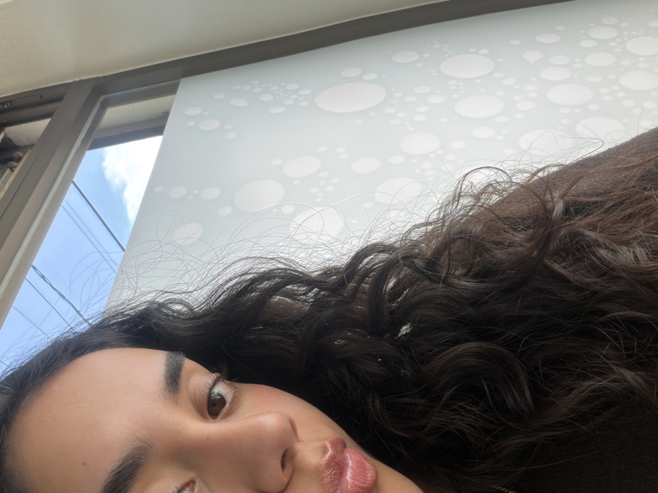 A partial view of a woman's face with a slightly puckered mouth and one visible brown eye, framed by long, wavy dark brown hair. The backdrop is a sliding glass door or window with a frosted privacy film patterned with white circles of varying sizes. Outside the window, a glimpse of blue sky and power lines are visible. The perspective is tilted, looking up towards the window.
